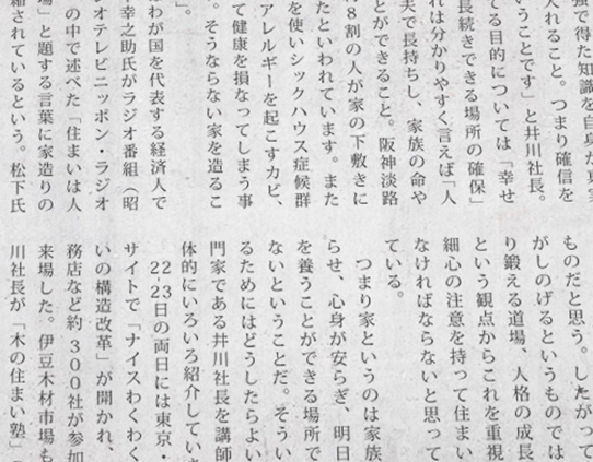 桐のおはなし 桐は古くから箪笥など大切なものを保管する用途に多く用いられてきました。あまり知られていない桐の不思議な性質に迫ります。 新聞連載「木の住まい塾」 住まいとは何かを考える、伊豆新聞(伊豆日日新聞・熱海新聞) に連載された記事に、画像、リンクを加え掲載しています。 バイオ木材乾燥機 世界初の乾燥技術を用いた、細胞を破壊せずに木材を乾燥させることのできる「バイオ木材乾燥機」をご紹介します。 住まいとは何かを学び、家づくりに役立てて頂く無料の勉強会です。中立的な立場からの専門的なアドバイスも受けられます。 お施主様への完成引渡しを保証する住宅完成保証の仕組みです。着工したお客様の家を確実に完成させ、お引渡しを保証します。